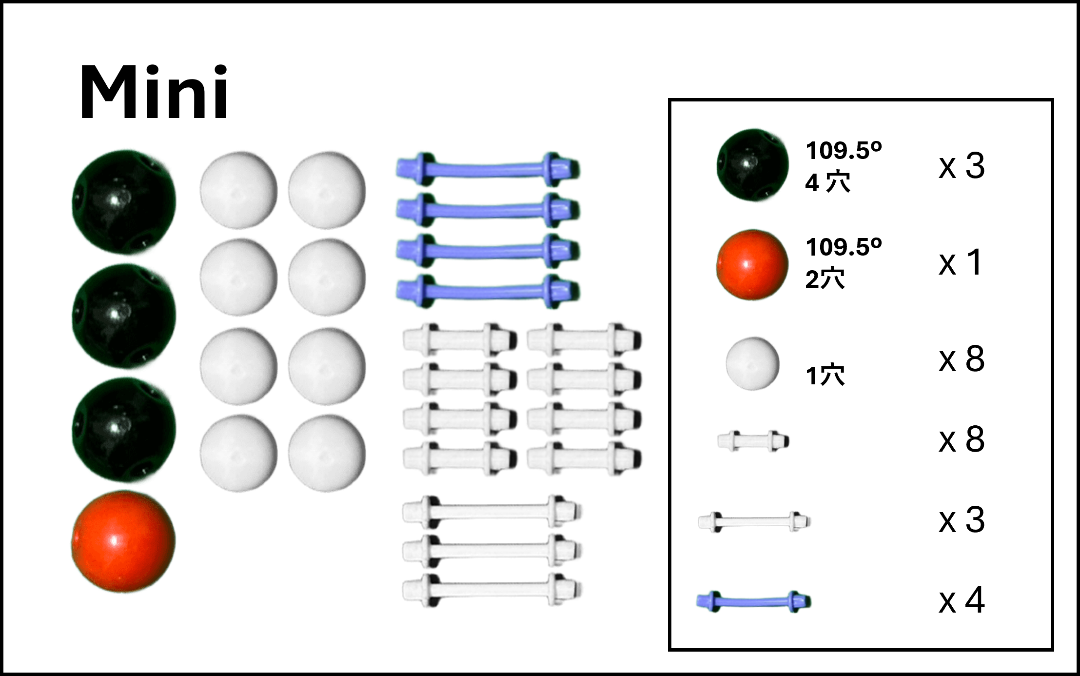 Miniセットではメタノール・エタノール・アセトンなどの簡単な分子を製作可能で、他セットご購入者の追加購入としてもちょうど良い分量です。
