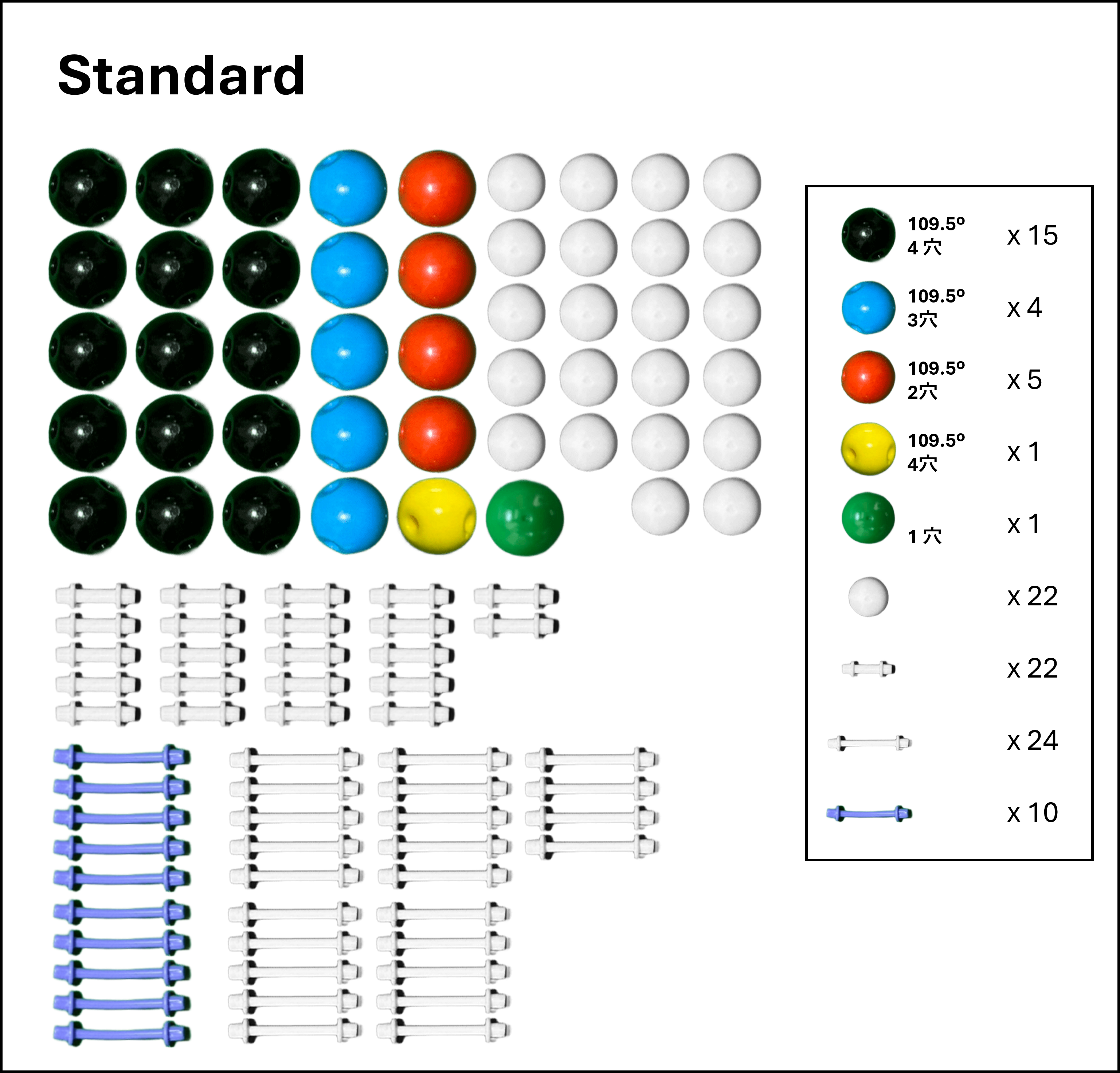 Standard Setは、Natural Setでは少し物足りない高校生~大学生に最適な内容です。学習した有機化合物の構造を確認したり、有機反応の反応機構を視覚的に理解する手助けとなります。