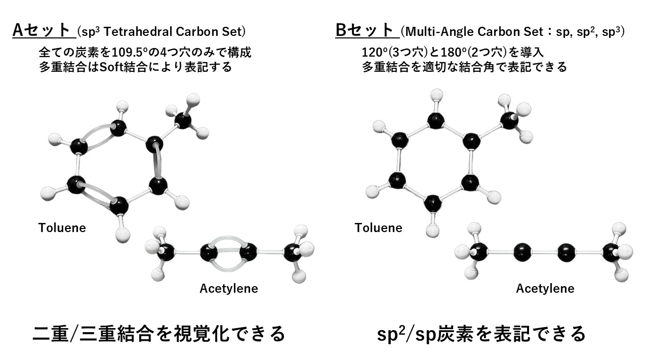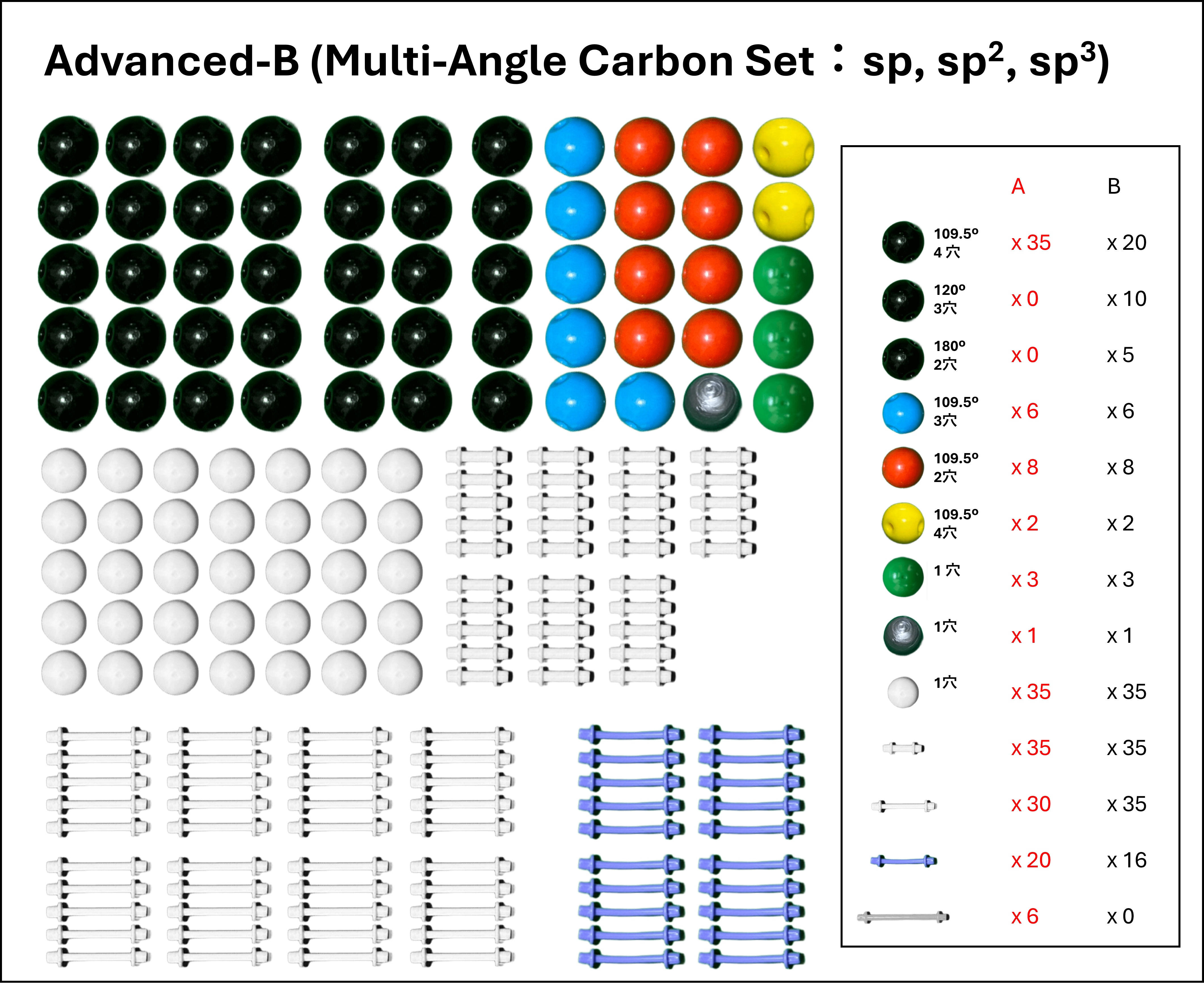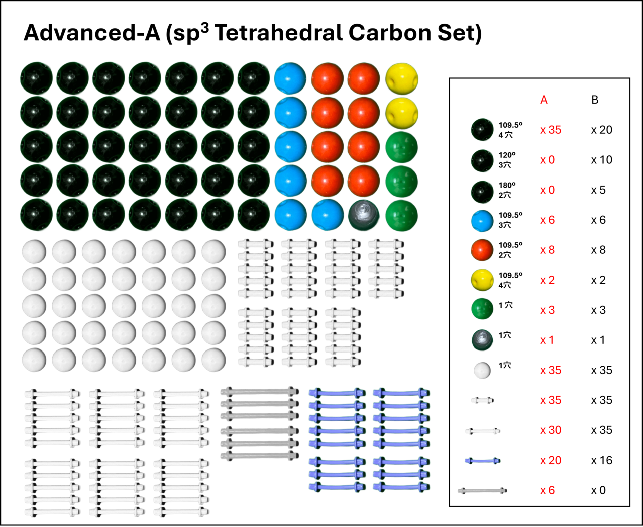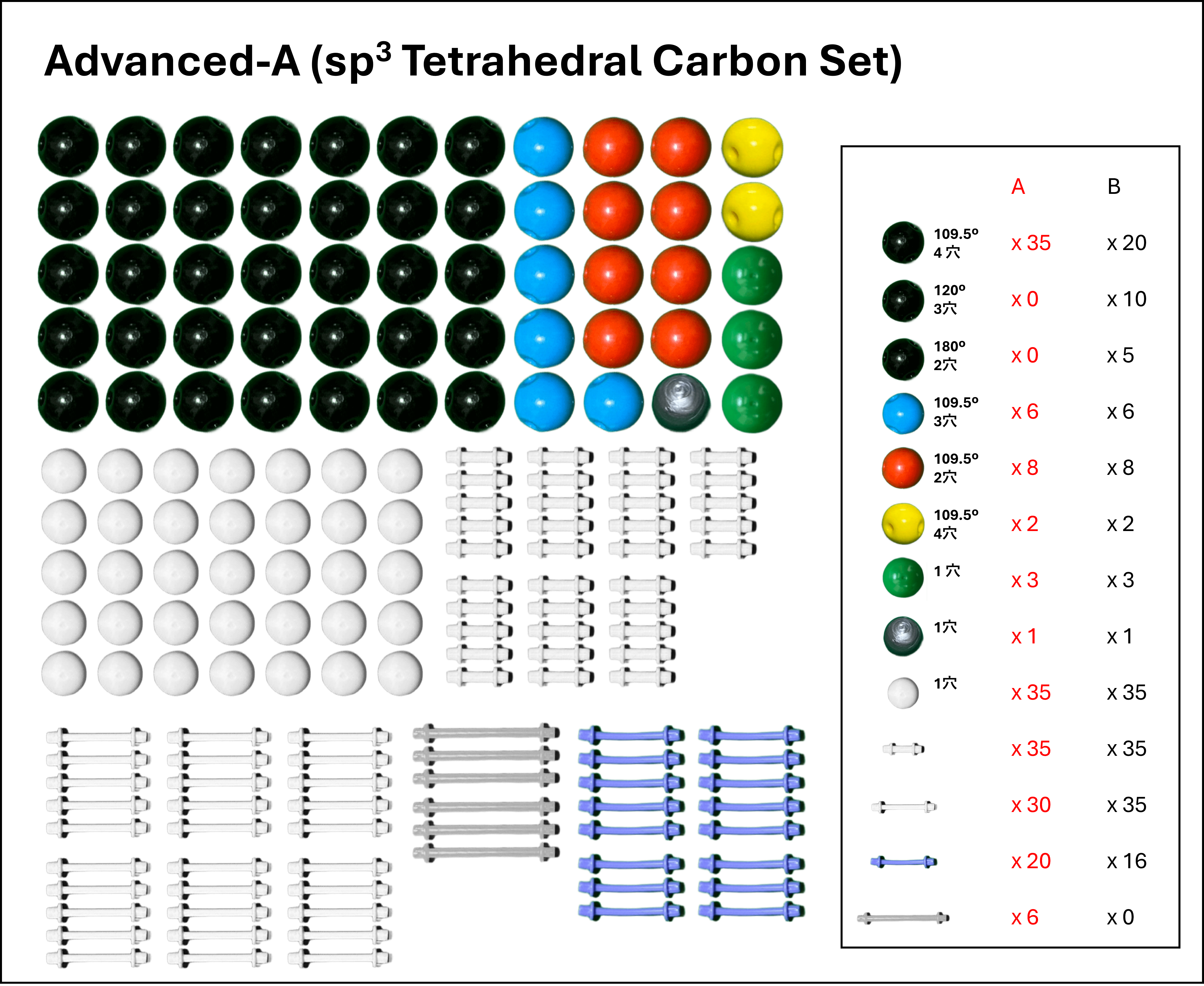 Advanced Setは大学生向けのセットです。sp3炭素のみのAセットと、sp2/sp炭素を取り入れたBセットの2種類をご用意しています。3次元的な立体構造を確認するのに最適です。