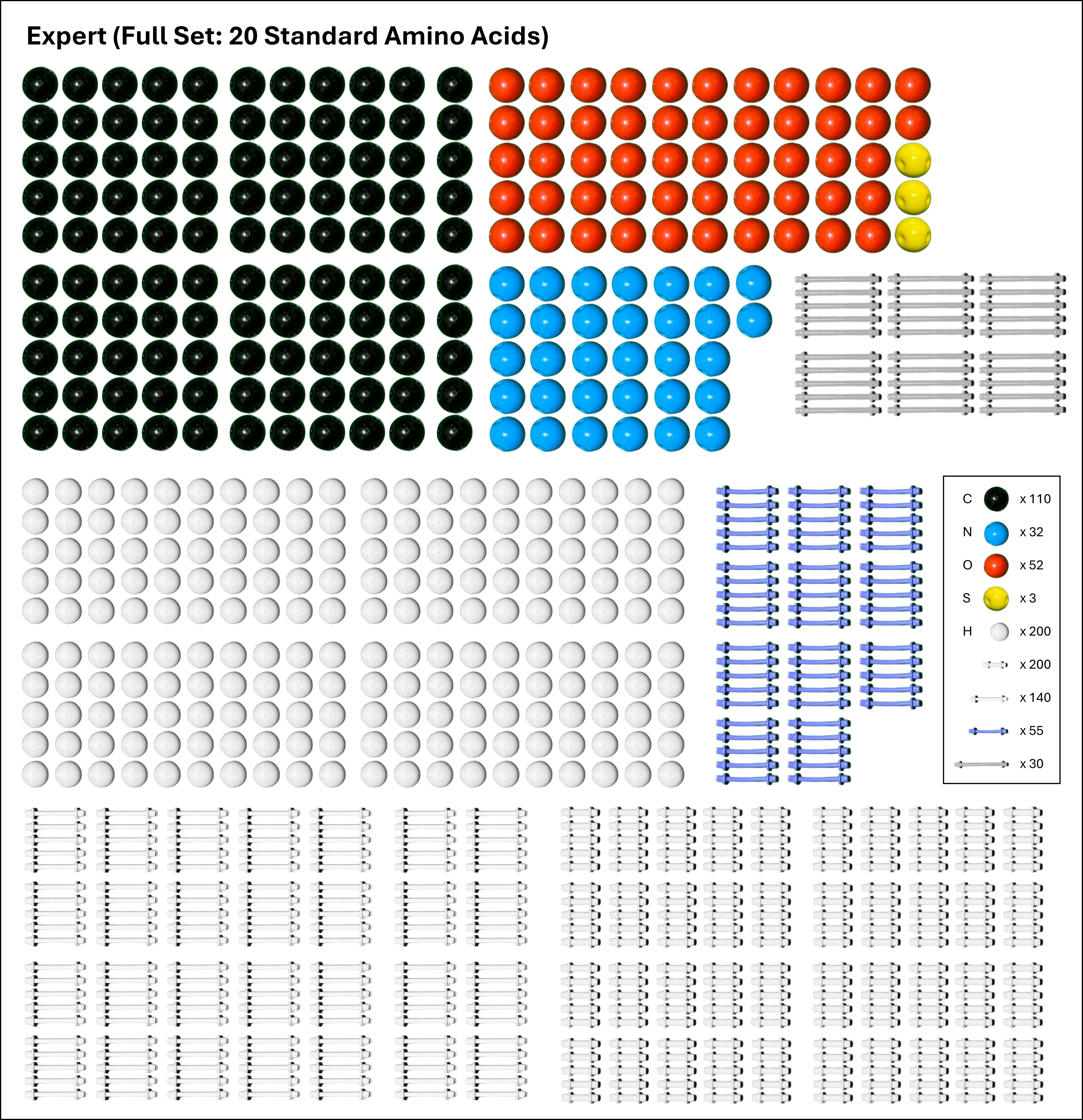 Expert Setは、タンパク質構成アミノ酸20種を全て製作することができます。また複雑な天然物の構造など、あらゆる構造を作成可能です。研究室に1個置いておくと学生の研究を手助けします。