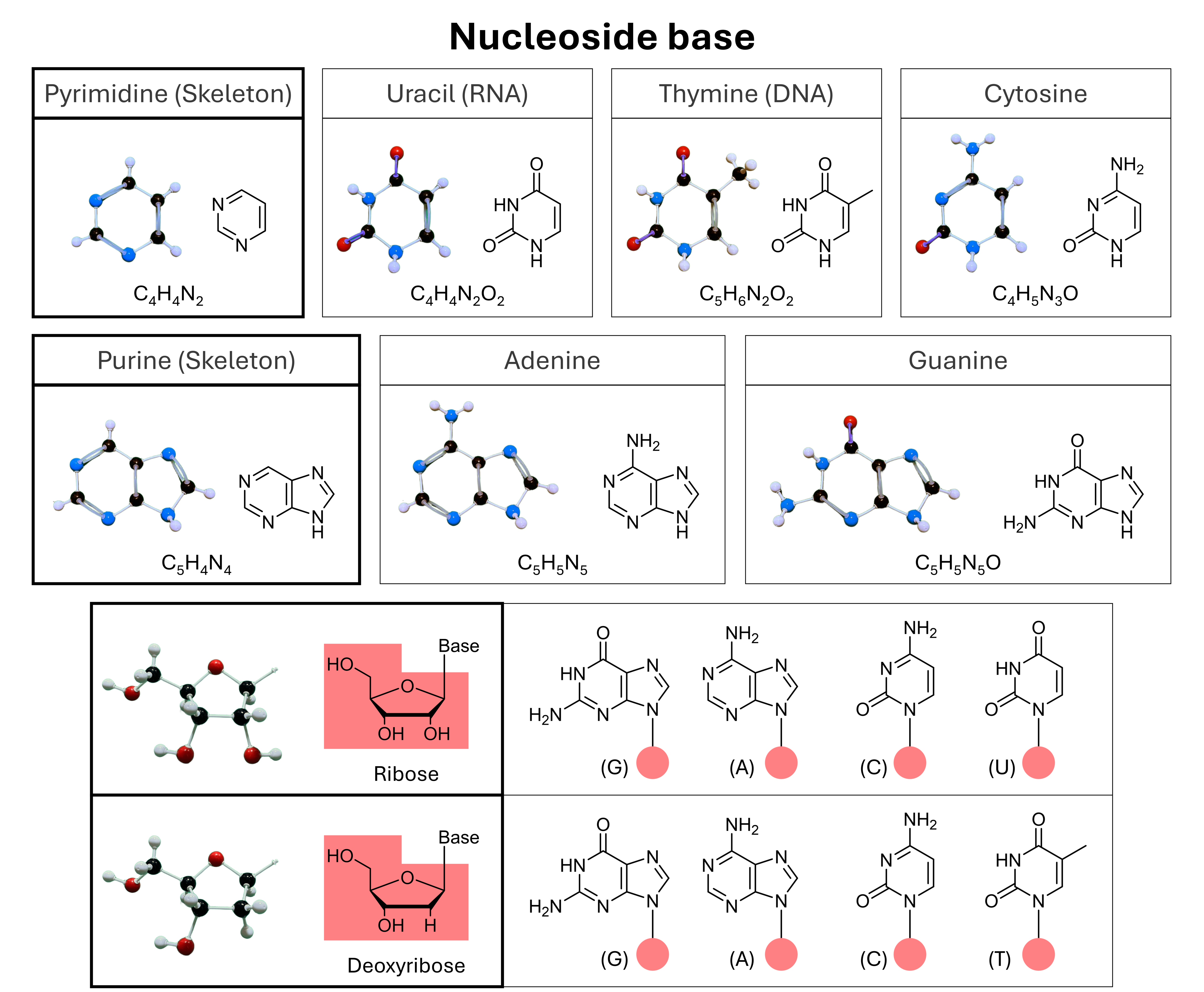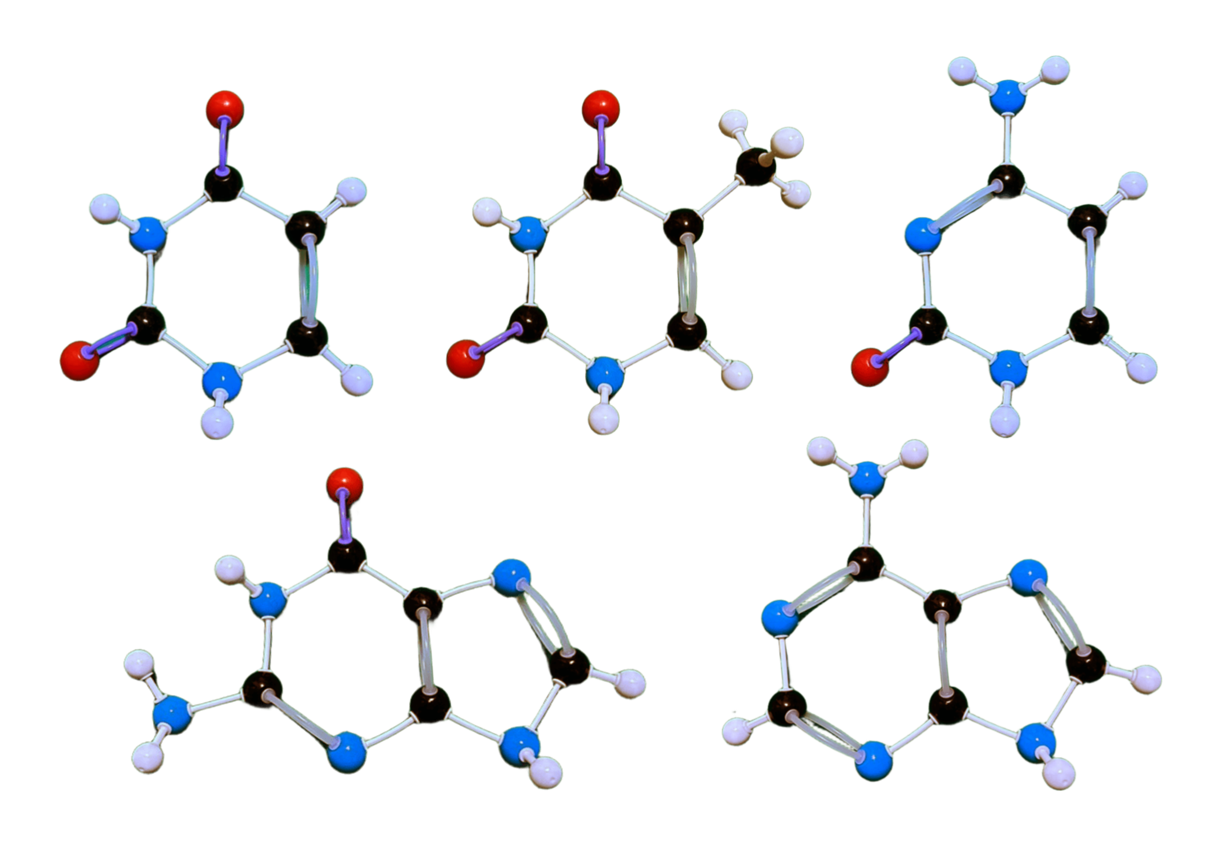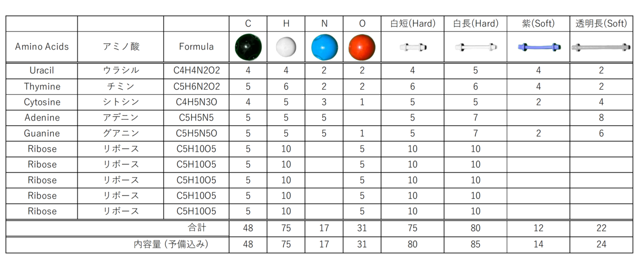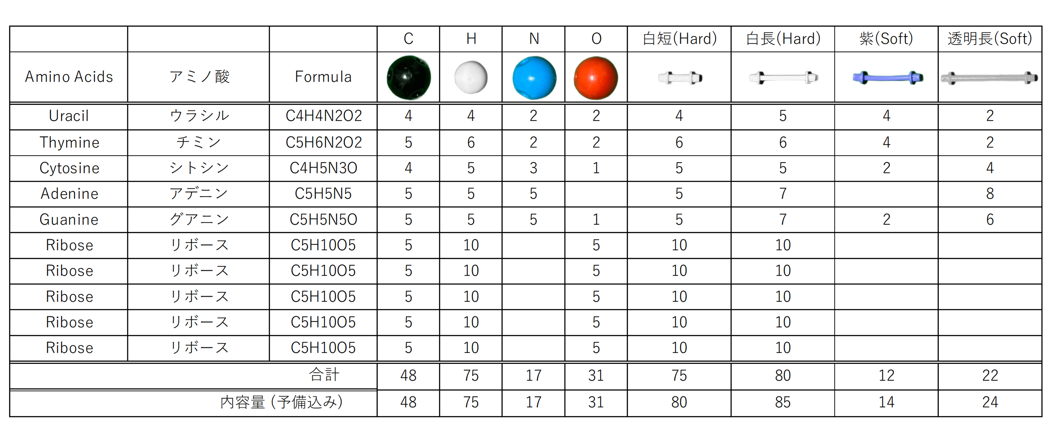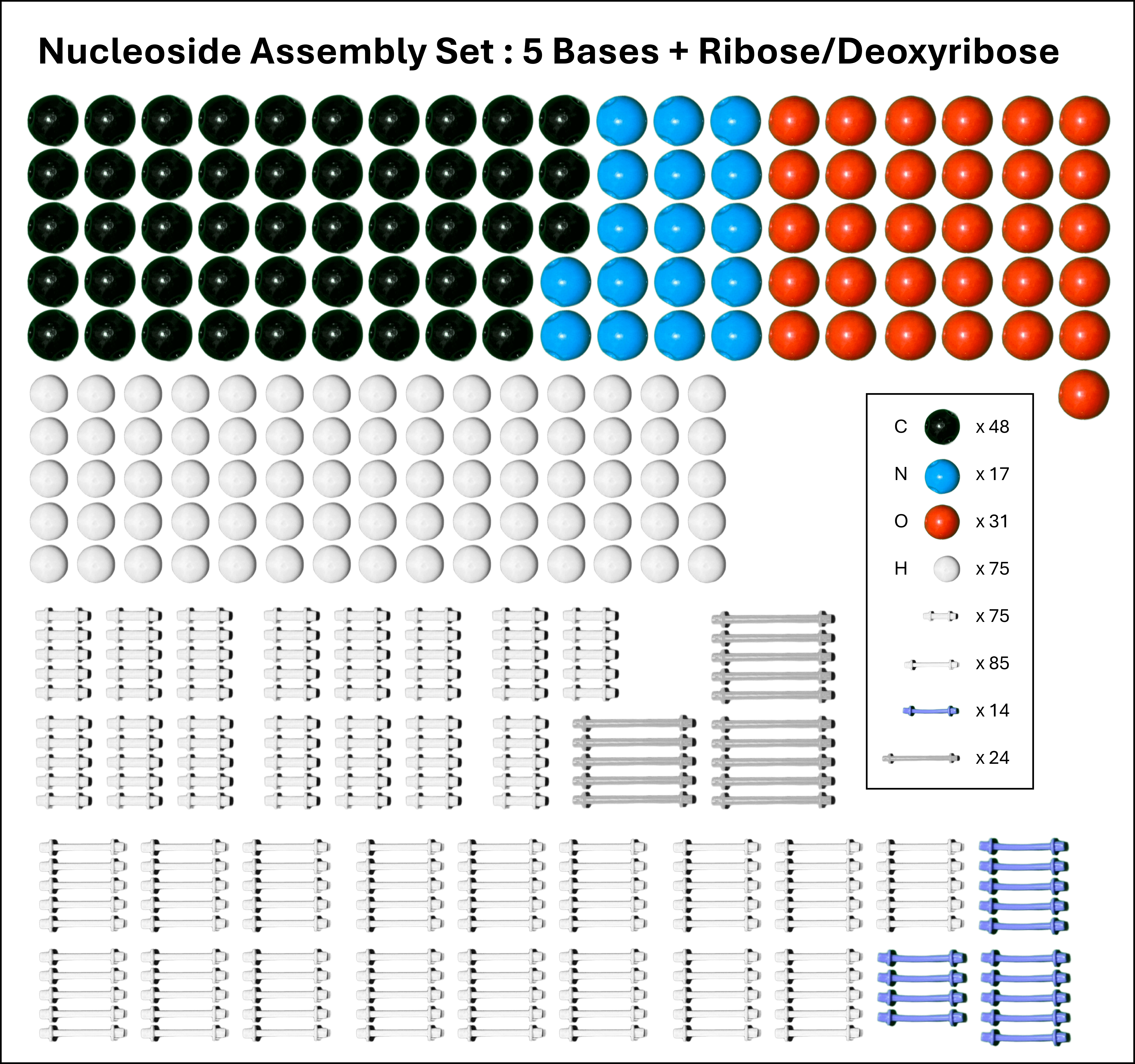 Nucleoside Assembly Setでは、DNA/RNAを構成する5つの核酸塩基+リボース/デオキシリボースを作成可能です。生物・生化学の学生に最適なセットです。