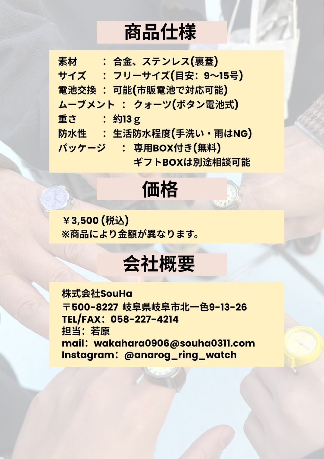 リングウォッチ Ana-Rogは、ファッションと機能性を兼ね備えた新感覚の時計です。指にフィットするデザインが特徴で、手元をおしゃれに演出します